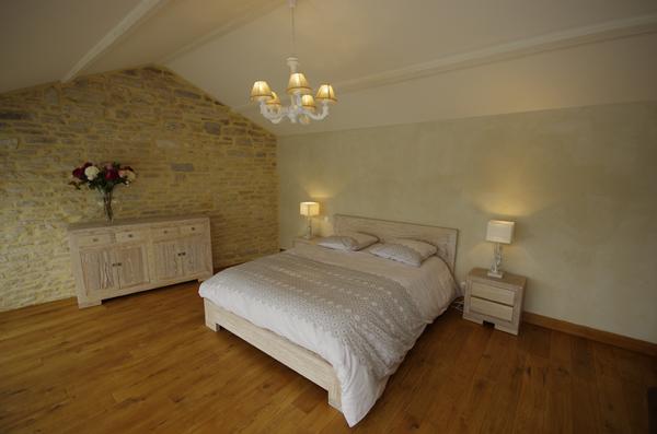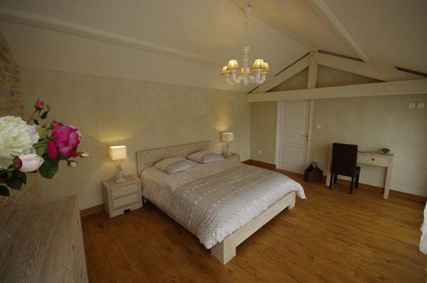 Au premier étage, là où était stockée la paille pour l'hiver, la chambre est baignée de lumière, avec ses larges baies vitrées donnant sur le jardin et la piscine.